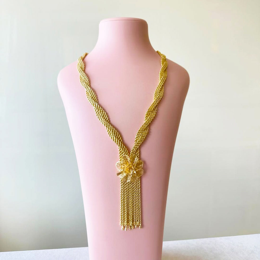 Köstekli yapısı, altın zincirlerin zarifçe boyna dökülmesini sağlarken; zengin formlu yerleşimi ile boynunuzu çevreleyerek asil bir duruş kazandırır. Geleneksel altın takı setlerine modern bir yorum getiren bu tasarım, sadece bir aksesuar değil; bir ömür boyu taşınacak bir hatıradır.