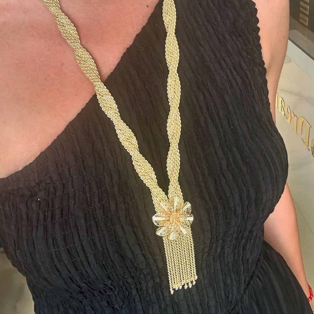 İster düğününüzde ister nişan ya da kına gecenizde tercih edin, bu altın gerdanlık görünümünüzü tamamlayan en dikkat çekici parça olacak.